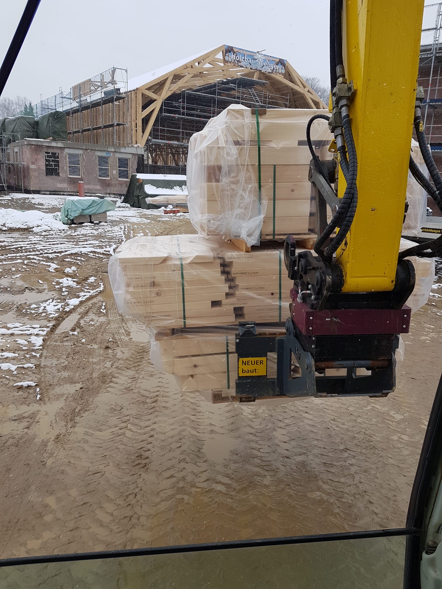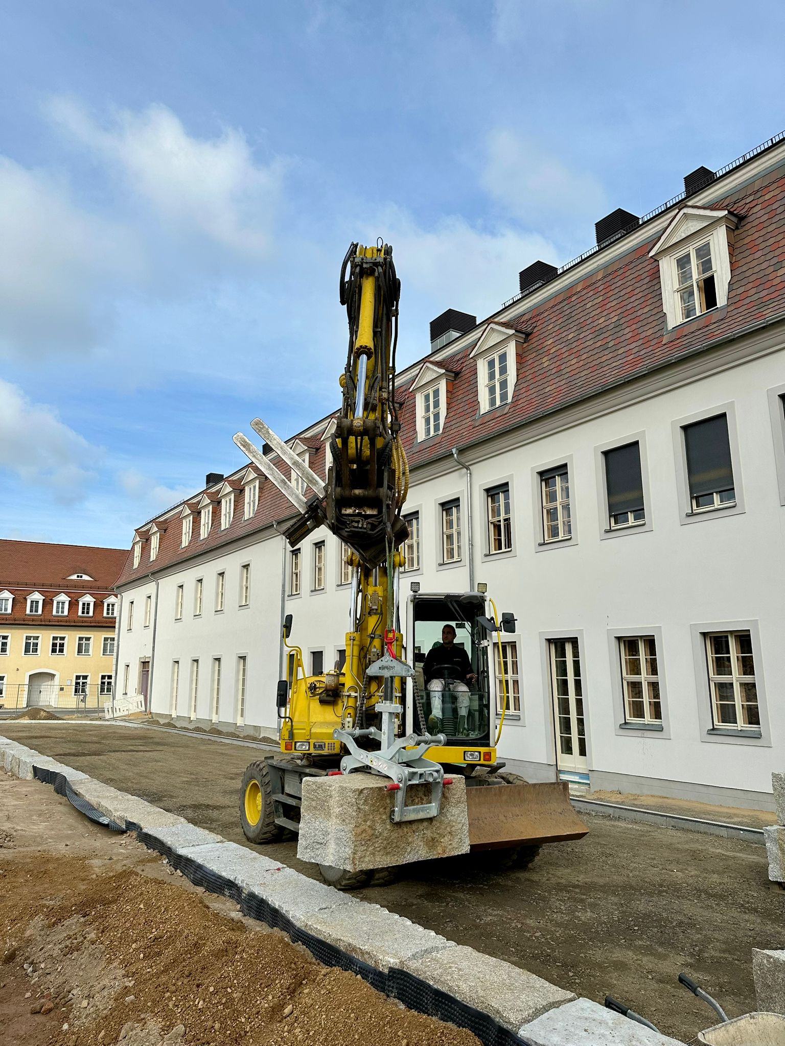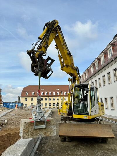 beispielsweise ein historisches Treppengeländer zu versetzen oder eine Palette mit Steinen oder Ziegel zu transportieren, was in den engen Straßen der Altstädte oft sehr schwierig war. Mit der Kombination aus Palettengabel und RotoTop kann nun der Bagger auf den schmalen Straßen diese Transportaufgaben übernehmen. „Bei unserem derzeitigen Projekt in Zittau wäre der Platz mit einer Straßenbreite von drei Metern auch viel zu eng für einen Radlader. Mit dem Bagger kommen wir so in wirklich in jede Ecke.“