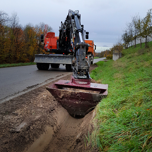 Ez elengedhetetlen az útpadkák simításához, valamint árok és árkok kialakításához és tisztításához. VarioLöffel® kanalunk kerekes kotrógéppel kombinálva kerekes rakodóként is használható.